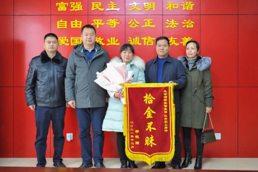 近日,娄底市大埠桥街道办事处石马居委会村民邬女士将写着“拾金不昧”的锦旗送到了伟德国际1946官网人力资源部人员蒋伟手上。邬女士激动地说:“这么大的背包丢了我还完全不知情,直到了你们打来电话我才知道包丢了。里面证件一旦丢失,会带来很多麻烦,真是太感谢你了!”
