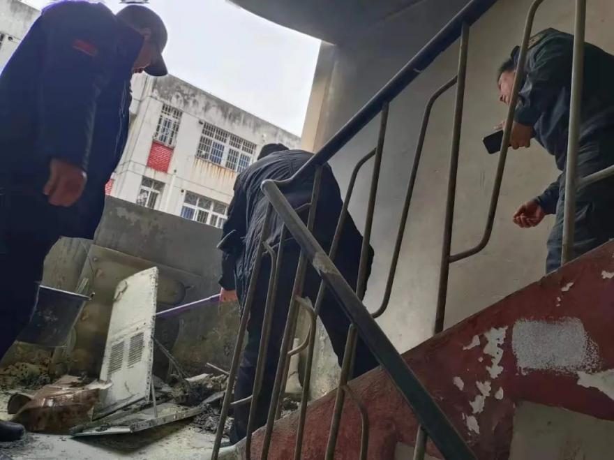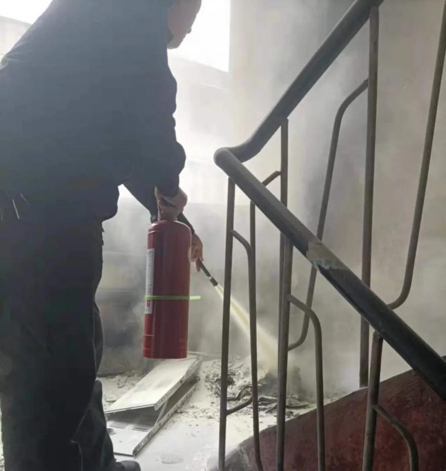 此时,楼道里存放的废弃纸箱、煤球等杂物被火点燃,距火势不到5米远的地方,能强烈地感受到大火炙热烤人脸,疏散业主撤离至安全区域后,冒着被烧伤的危险,顶住呛人浓烟,队员们拿起干粉灭火器冲入火场,对准火苗喷射灭火,仅用5分钟将明火扑灭。随后,物业人员对一片狼藉的现场进行简单清理,检查起火原因,消除隐患,撤除警戒。